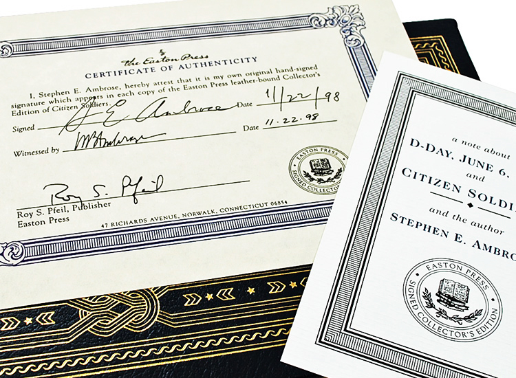 Easton Press, Norwalk, CT. (1995, 1997, 2002) . Stephen E. Ambrose. "D-Day: June 6, 1944. The Climactic Battle of World War II", "Citizen Soldiers: The US. Army from The Normandy Beaches to The Bulge to the Surrender of Germany", "Band of Brothers" Signed Limited Edition three volume matching set. Includes original Certificate of Authenticity and publisher's notes. Luxuriously bound in navy blue full genuine leather with 22kt gold accents and gilded page edges. Very Fine, sealed without any flaws.