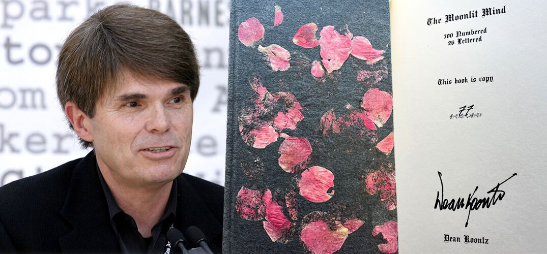 Charnel House. New York. 2012. Dean Koontz "The Moonlit Mind: A Tale of Suspense". Signed Limited Edition No. 77 of 300. Personally signed by the author directly onto the limitation page. Hardcover book without dust-jacket as issued. This special signed collector's edition is covered with rose petals. Very Fine without any flaws.