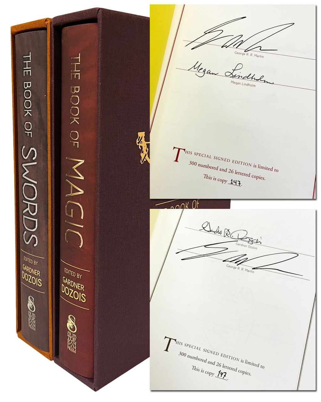 Subterranean Press (2014,2019) "The Book Of Swords", "The Book Of Magic". Signed Limited Edition Matching set. Each volume is number 147 of 300. Personally signed by each author and contributor. Thirty four signatures in all that include George R.R. Martin, C. J. Cherryh, Gardner Dozois, and all others. Hardcover books with dust-jackets. Slipcased Deluxe Editions. Very Fine collection without any flaws. Archival acid-free Mylar on dust jacket sleeves.