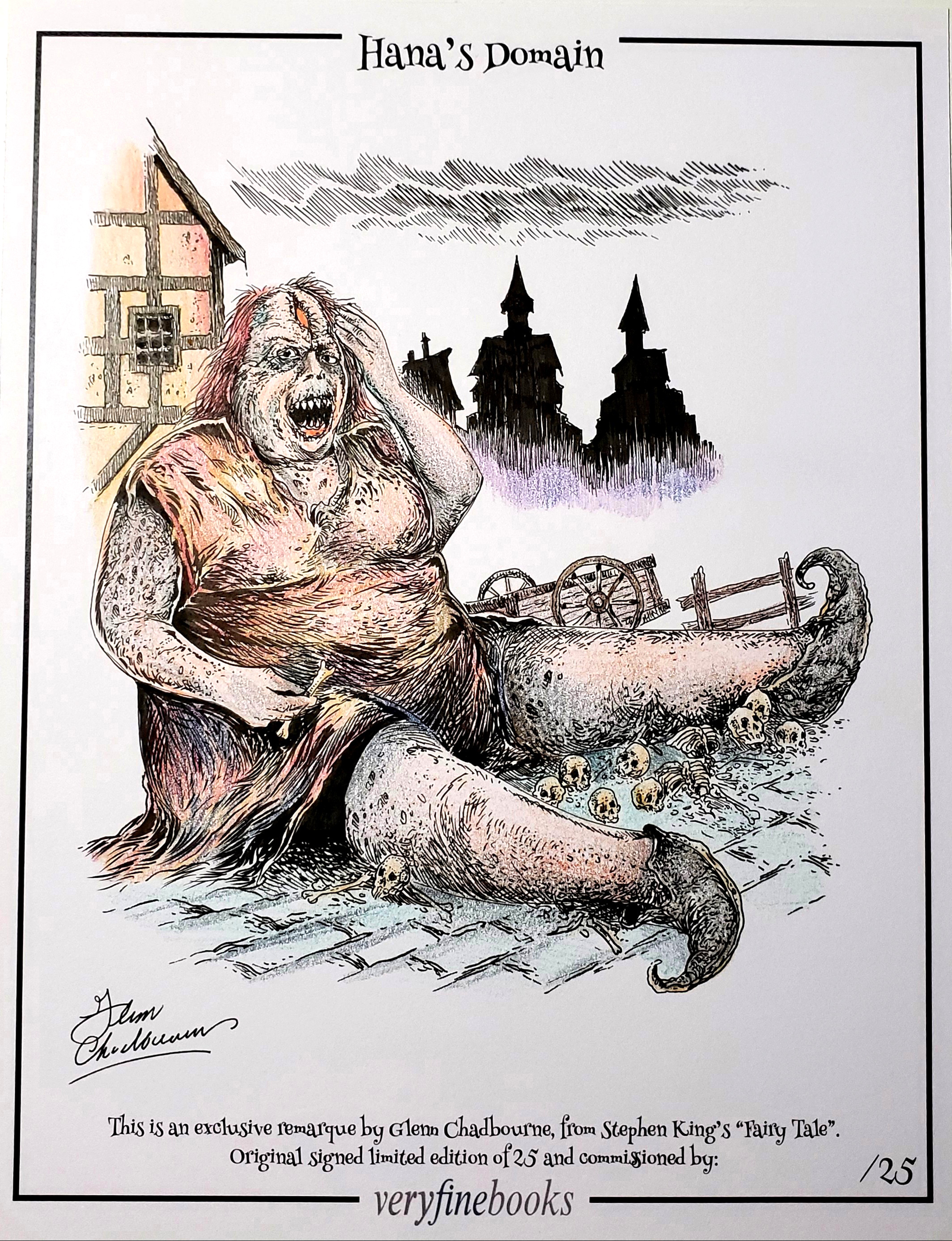 The remarque adds a special value because it is a one-of-a-kind original. This detailed finished full-color drawing ties in with the subject matter of the novel and is personally and individually drawn for you by Glenn Chadbourne. This highly collectible piece of artwork depicts the giant Hanna from Stephen King's novel "Fairy Tale". A unique opportunity to own an original piece of work by the artist that will be a great image to display in your home or office. Ready for framing.