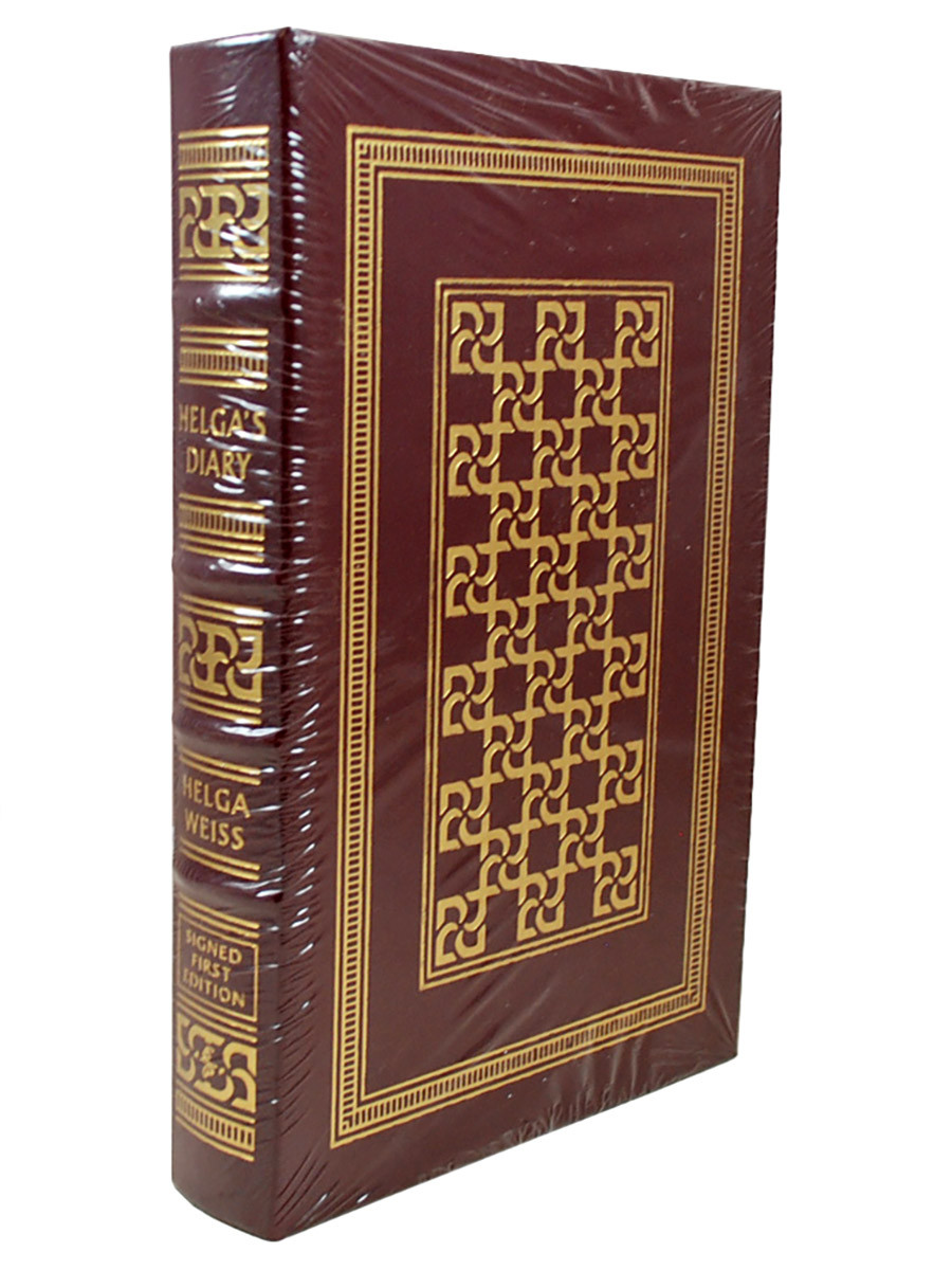 Easton Press, Norwalk, CT. 2013. Helga Weiss "Helga's Diary: A Young Girl's Account of Life in A Concentration Camp". Signed First Edition as stated. Full genuine leather. Signed by the author Helga Weiss on the special numbered limitation page. This new hardcover includes maroon leather with gilt decoration and lettering. Gilt page edges and place marker ribbon. Collector's noted by the publisher. As New without any flaws in the shrink-wrap.