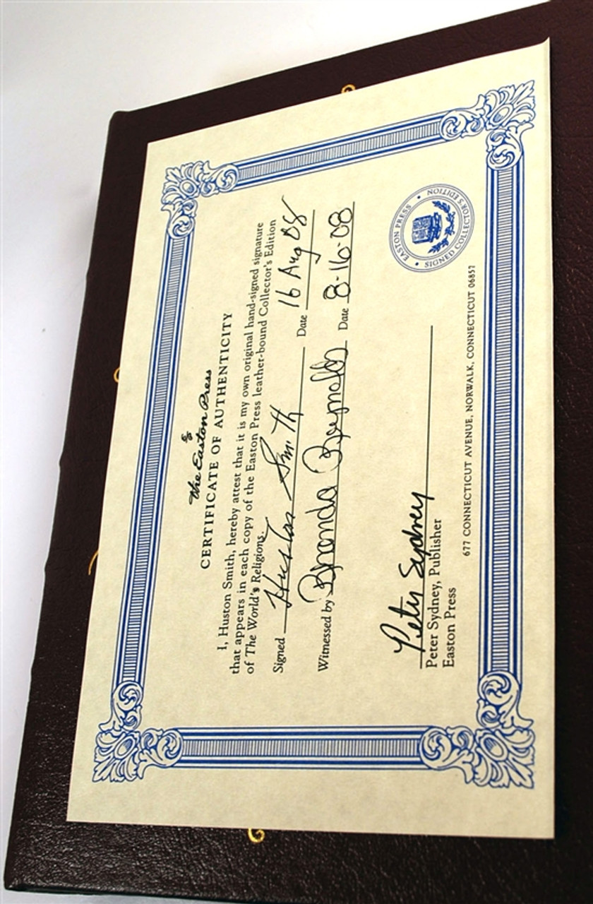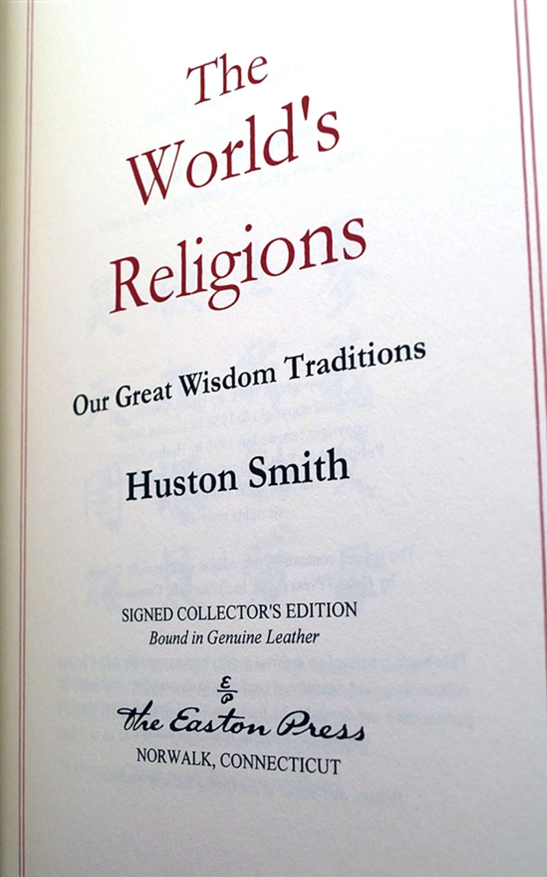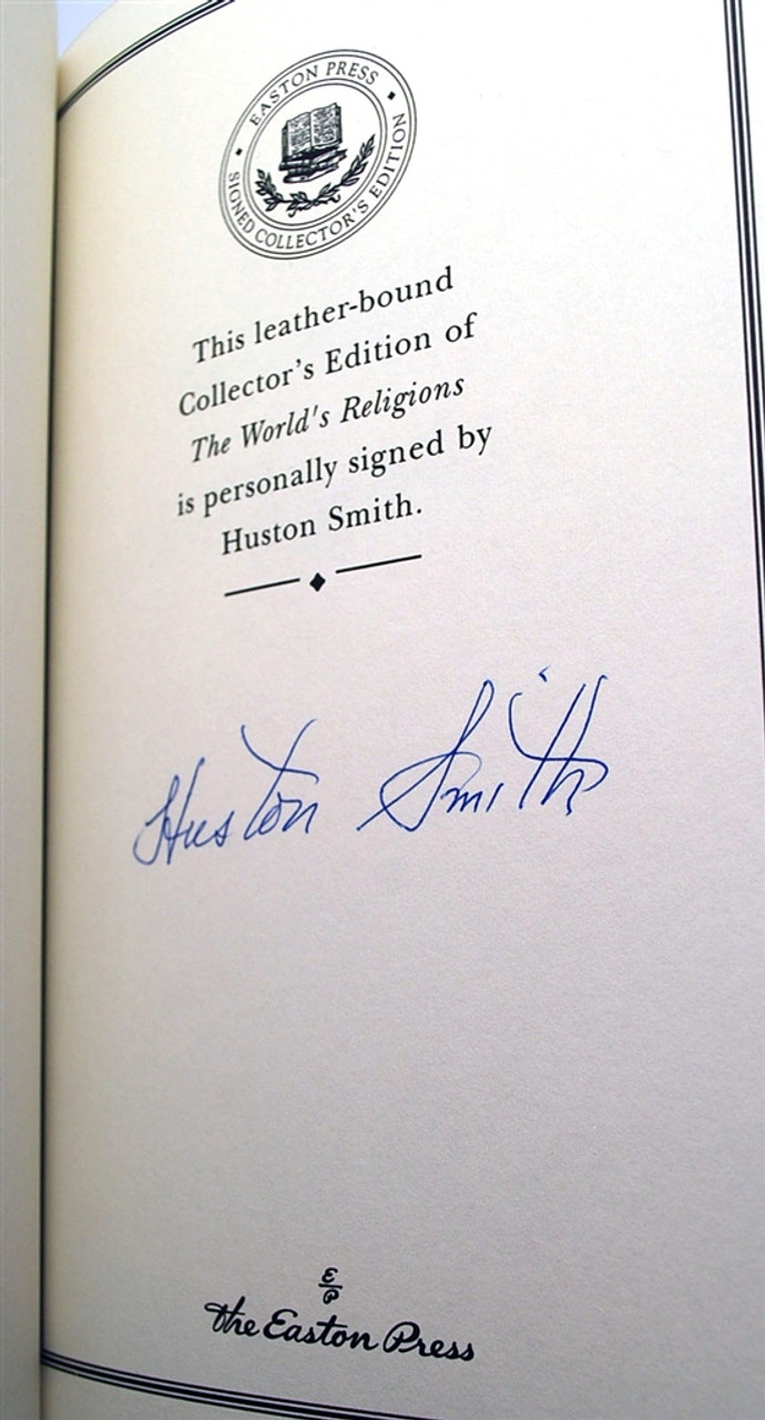 Easton Press. Norwalk, CT. 2008. Signed Collector's Edition. Huston Smith "The World's Religions: Our Great Wisdom Traditions". No jacket as issued. Full leather covers with gilt details. All edges gilt. Includes unattached bookplate and Easton Press Certificate of Authenticity along with collector's notes. Sealed in the original shrink-wrap.