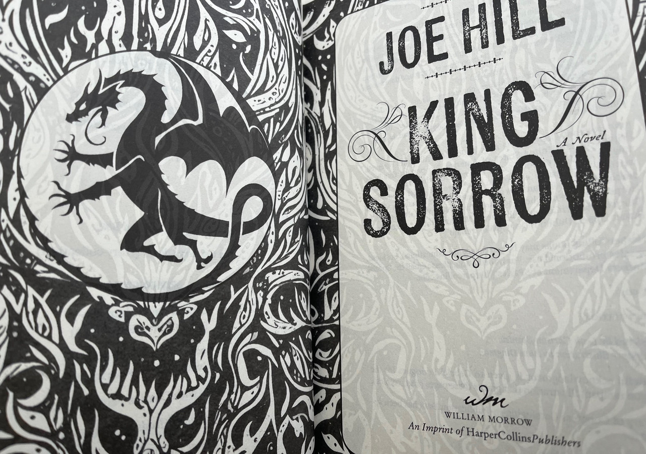 William Morrow (October 21, 2025). Joe Hill "King Sorrow". Signed First Edition, First Printing. Personally signed by Joe Hill directly onto the special title page bound within the book. Hardcover book with dust-jacket. 881 pages. Fine/Fine without any flaws.