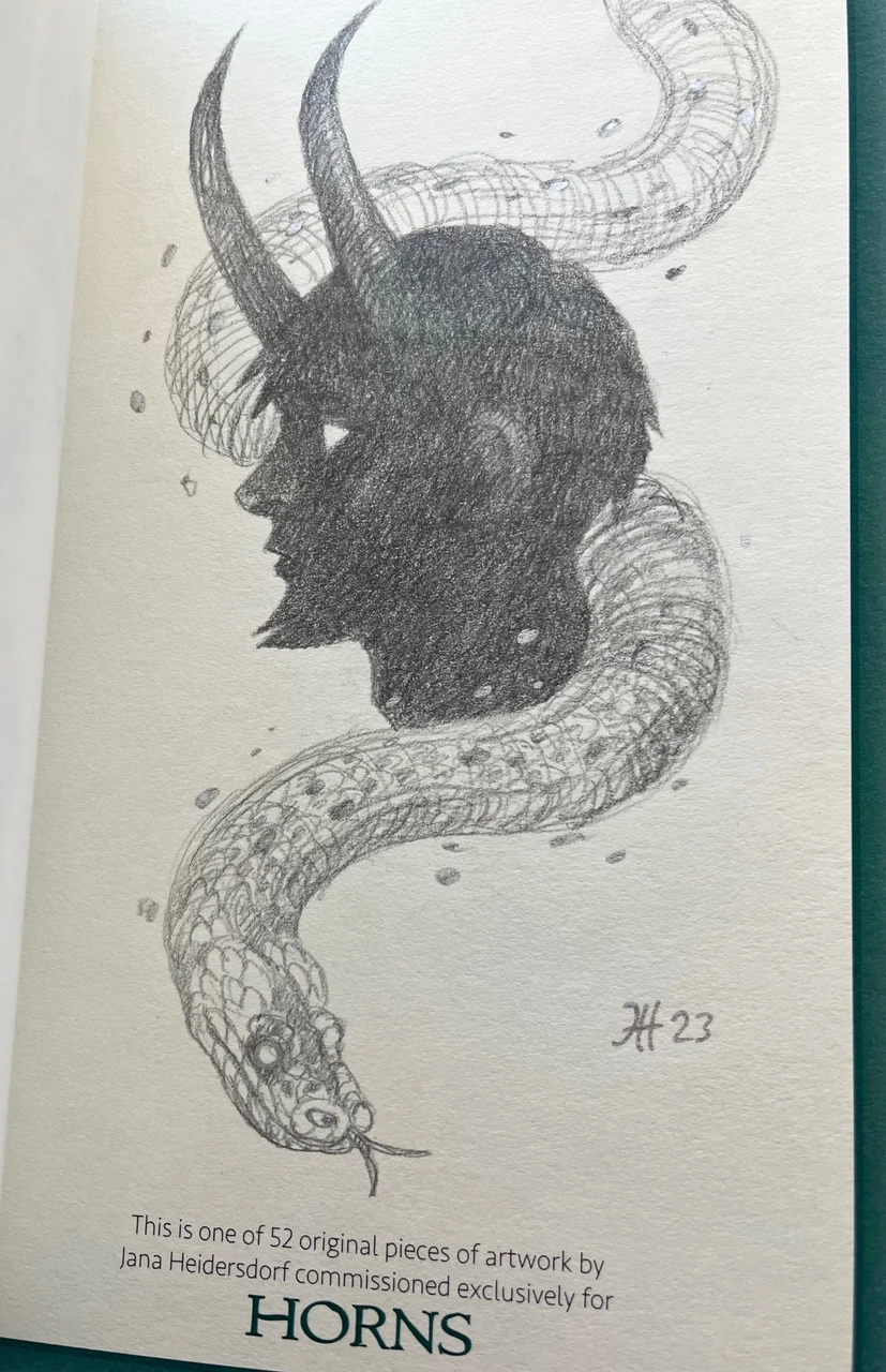 Horns has been personally signed by Joe Hill, Jana Heidersdorf, Stephen Chbosky, and Mathias Clasen. Includes a hand-tipped page of original artwork by Jana Heidersdorf.
