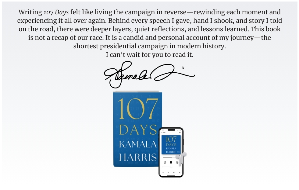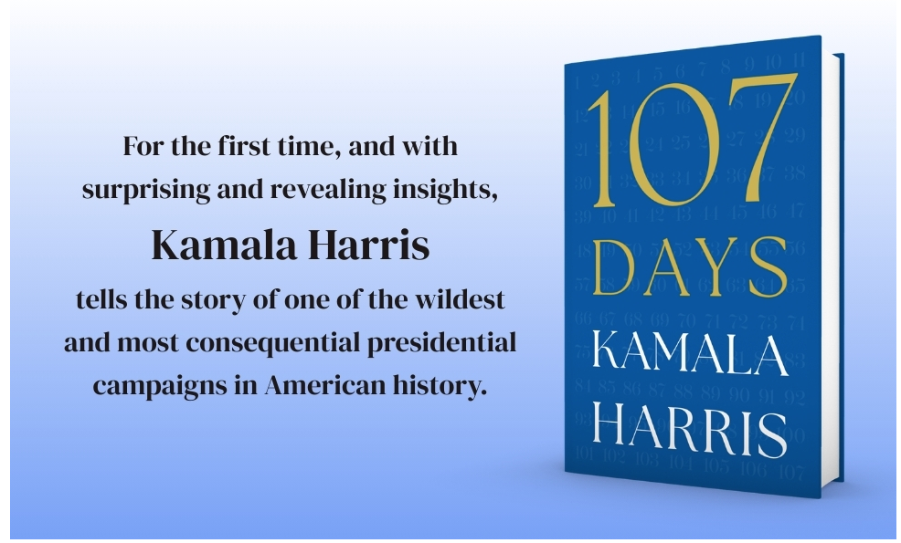 “Writing 107 Days felt like living the campaign in reverse—rewinding each moment and experiencing it all over again. Behind every speech I gave, hand I shook, and story I told on the road, there were deeper layers, quiet reflections, and lessons learned. This book is not a recap of our race. It is a candid and personal account of my journey—the shortest presidential campaign in modern history. 107 Days is out on September 23. I can’t wait for you to read it.” – Kamala Harris