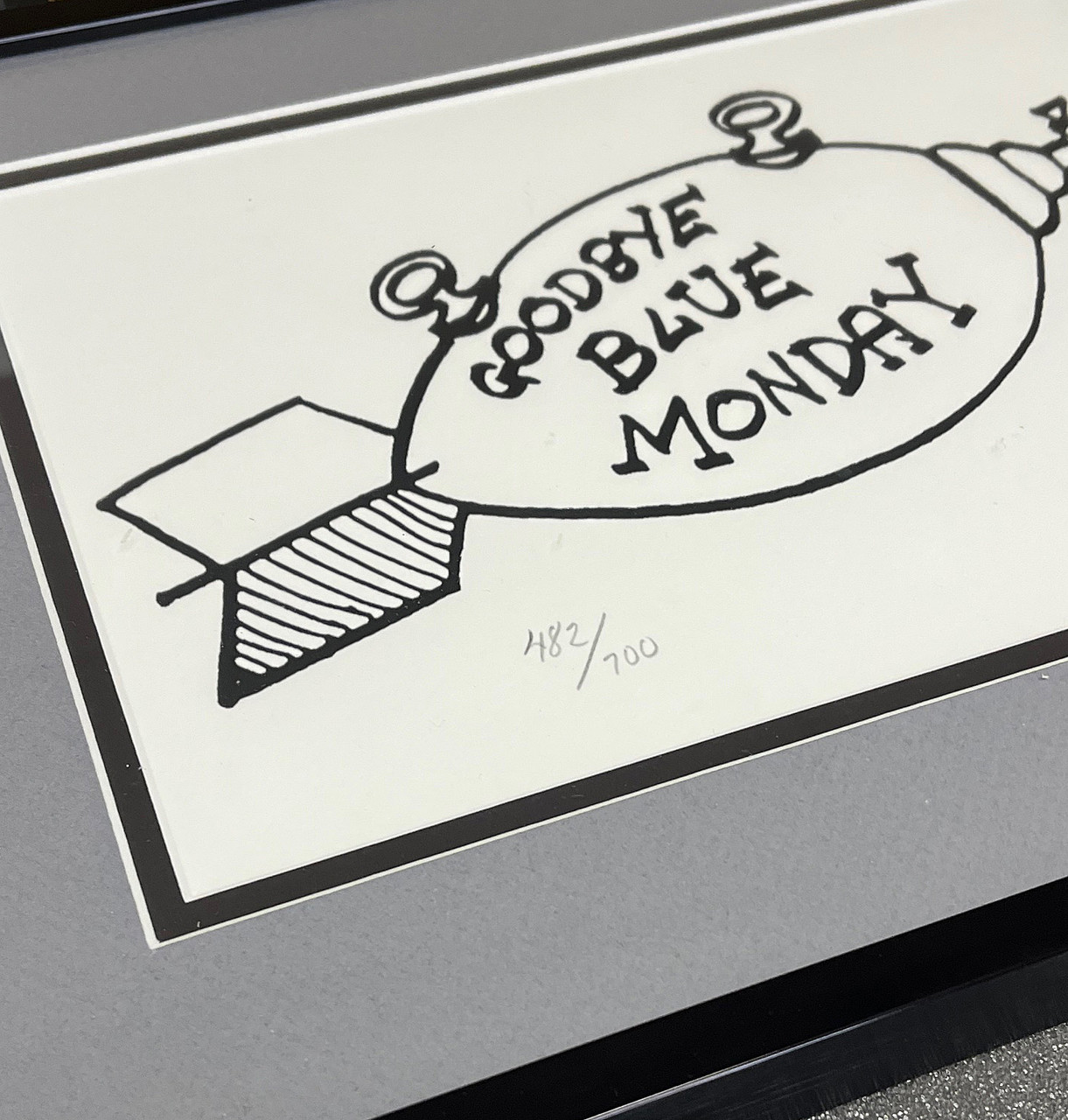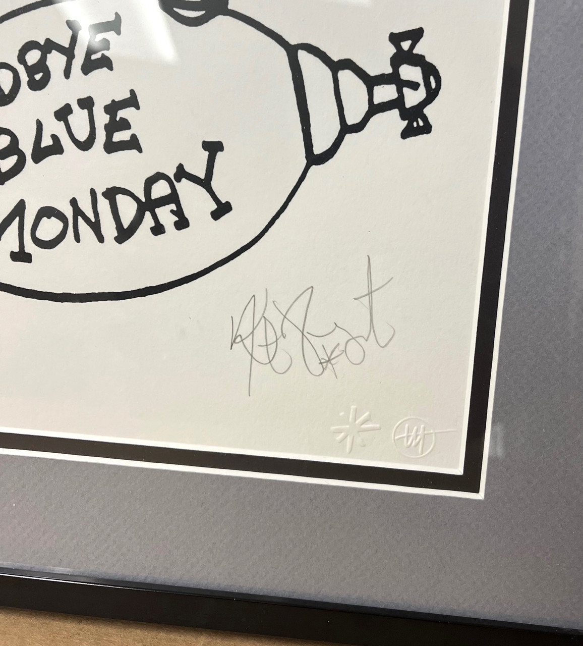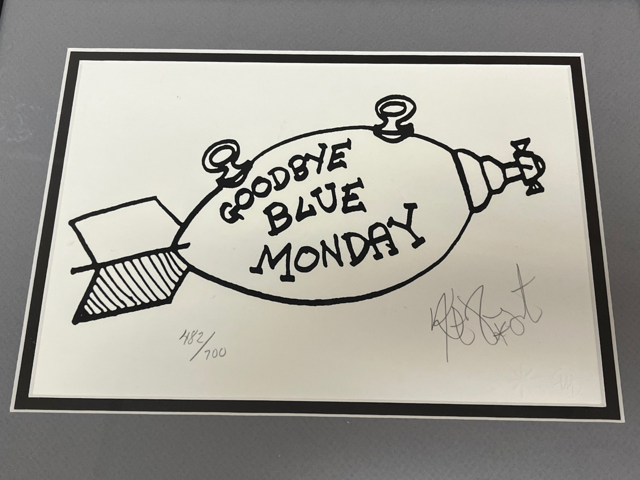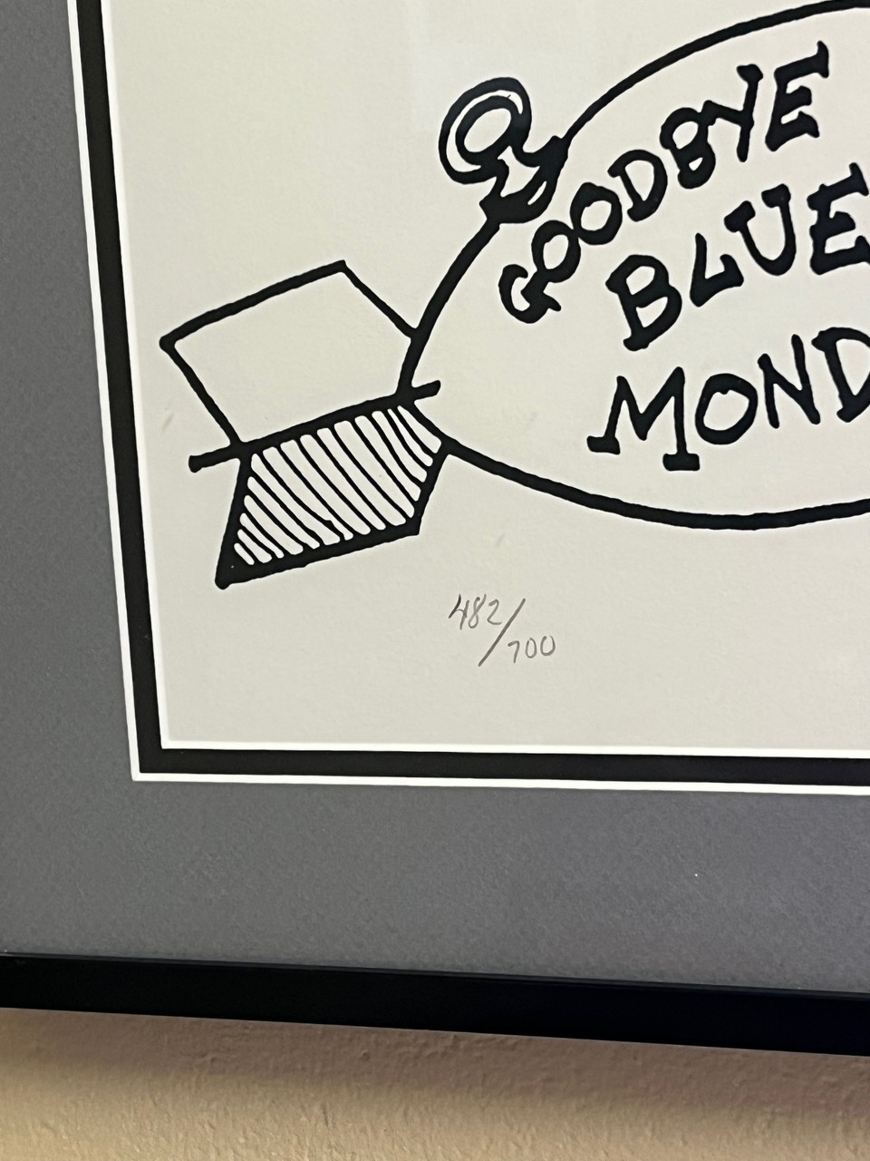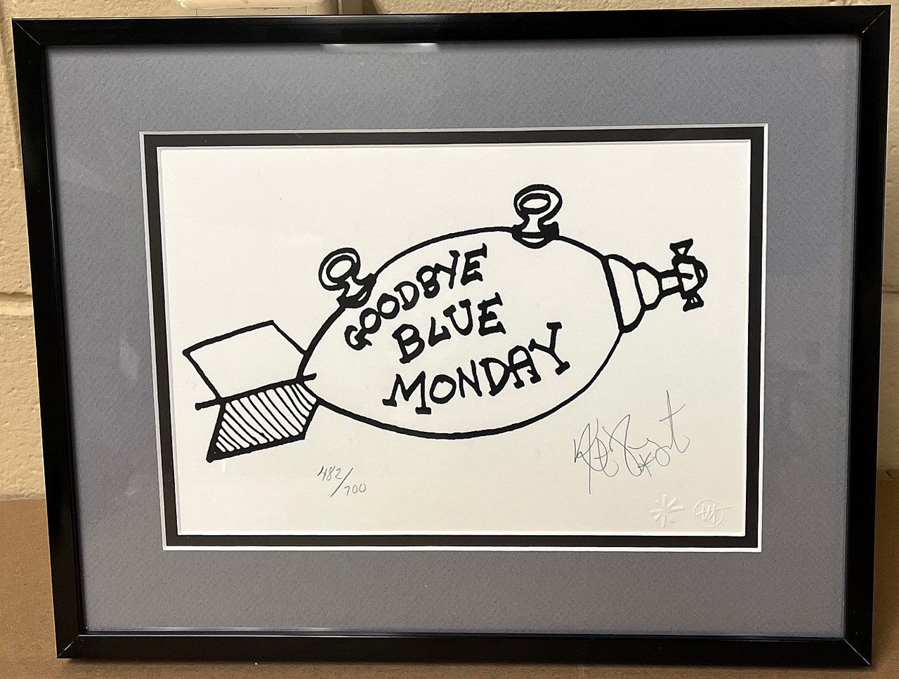 Kurt Vonnegut (American, 1922-2007) , Joe Petro III Graphics. "Adios" or "Goodbye Blue Monday". This original silkscreen has been Signed and Numbered in pencil by Mr. Vonnegut. This is Print #482 from a signed limited edition of 700 prints, printed in 2006. This one color silkscreen on white Rising Stonehenge paper 7 x 10 inches and is in "Fine Condition" as shown in the photographs. Joe Petro III was friends and collaborated with Kurt for over 14 years on his art. Includes COA.