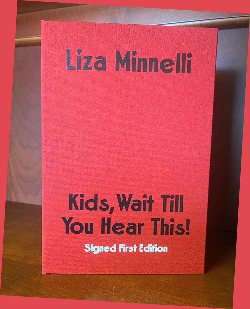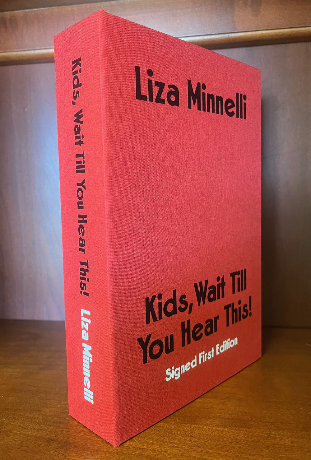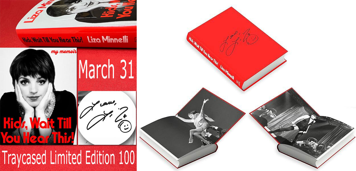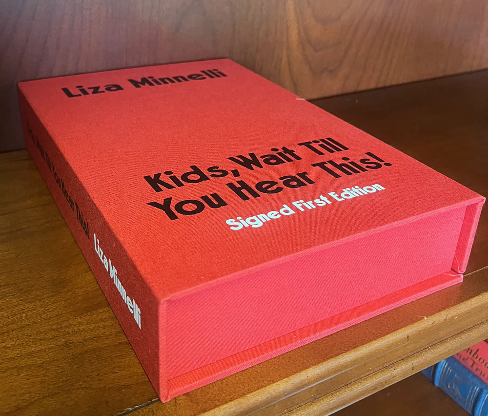Grand Central Publishing (March 10, 2026) Liza Minnelli "Kids, Wait Till You Hear This!" Signed by Liza Minnelli directly into the book. No bookplates which were then affixed into the book. Signed First Edition, First Printing. Hardcover book with dust-jacket. This special limited tray-cased edition is produced with a hand-numbered COA. The traycase is produced from high quality materials and design to match the feel and look of the book. The author’s name and book title is printed on the front surface and spine.