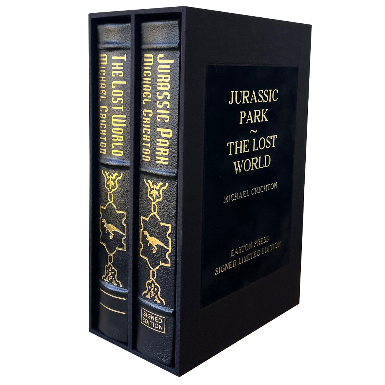 Easton Press 2008. Michael Crichton "Jurassic Park" and "The Lost World". Signed Limited Edition matching set. Black leather bound without jacket as issued. Jurassic Park has been personally signed by Michael Crichton. Includes original COA. Luxuriously bound with full genuine leather with 22kt gold accents. Bound in premium full leathers, hubbed spine, distinctive cover design, beautiful illustrations, permanent satin ribbon page marker, gilded page edges, moire end-sheets, and thread-sewn pages for durability and strength.