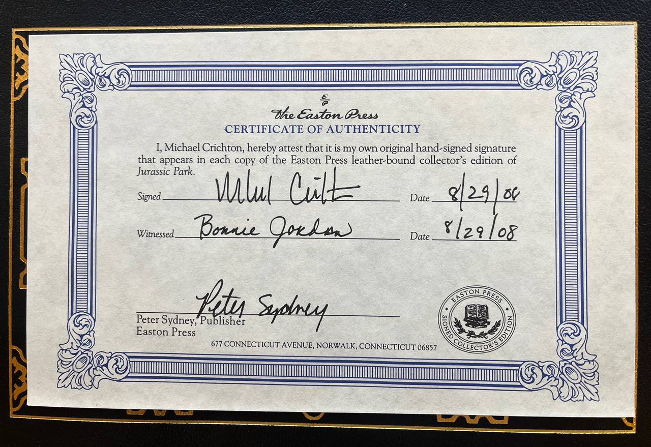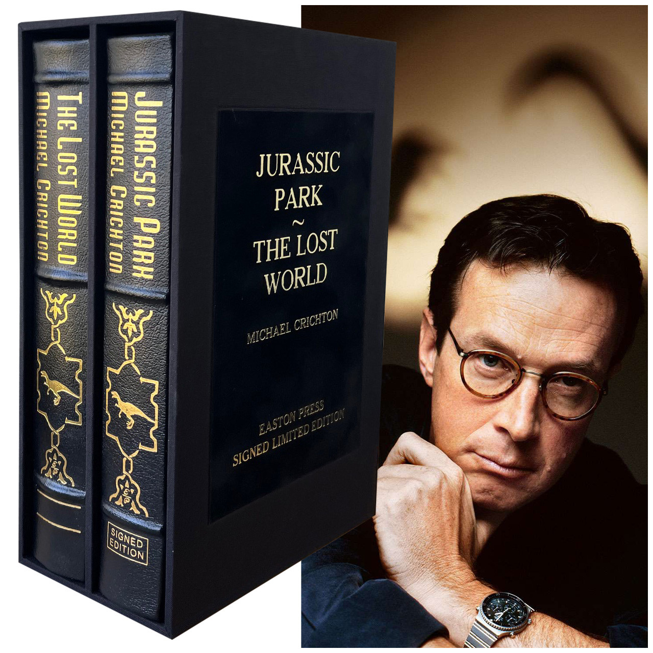 Easton Press 2008. Michael Crichton "Jurassic Park" and "The Lost World". Signed Limited Edition matching set. Black leather bound without jacket as issued. Jurassic Park has been personally signed by Michael Crichton. Includes original COA. Luxuriously bound with full genuine leather with 22kt gold accents. Bound in premium full leathers, hubbed spine, distinctive cover design, beautiful illustrations, permanent satin ribbon page marker, gilded page edges, moire end-sheets, and thread-sewn pages for durability and strength.