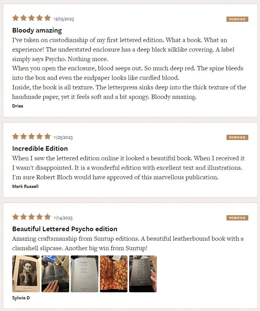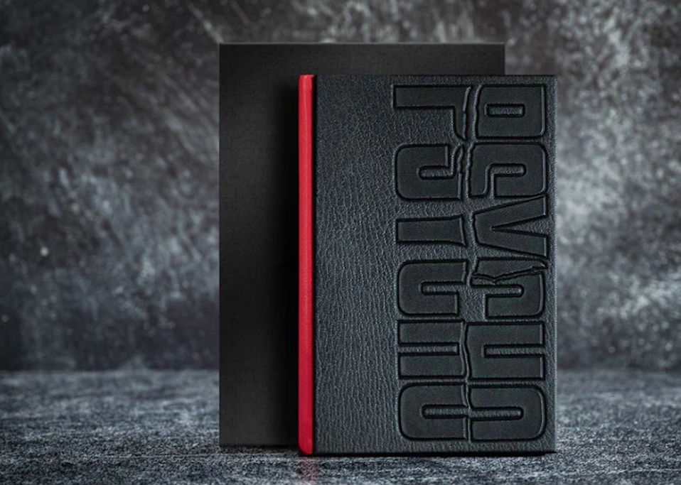 Suntup Editions 2023. Robert Bloch "Psycho" Signed Lettered Edition. The Lettered edition is limited to 26 copies and features a full goatskin Bradel binding with an embossed cover. This is Letter "O". Headbands are leather wrapped and endsheets are hand marbled for this edition by Claire Guillot in France. A color fold-out featuring the Artist edition dust jacket illustration is included. The edition is printed letterpress from metal type on handmade Velké Losiny paper. This historic paper mill in the Czech Republic was founded in the late 16th century and continues to produce handmade paper to this day. The edition is housed in a clamshell enclosure covered in two colors of Japanese cloth and lined with a luxurious velvet-like material. It is signed by Joe R. Lansdale, Gregg Kreutz and Paul Mann.
