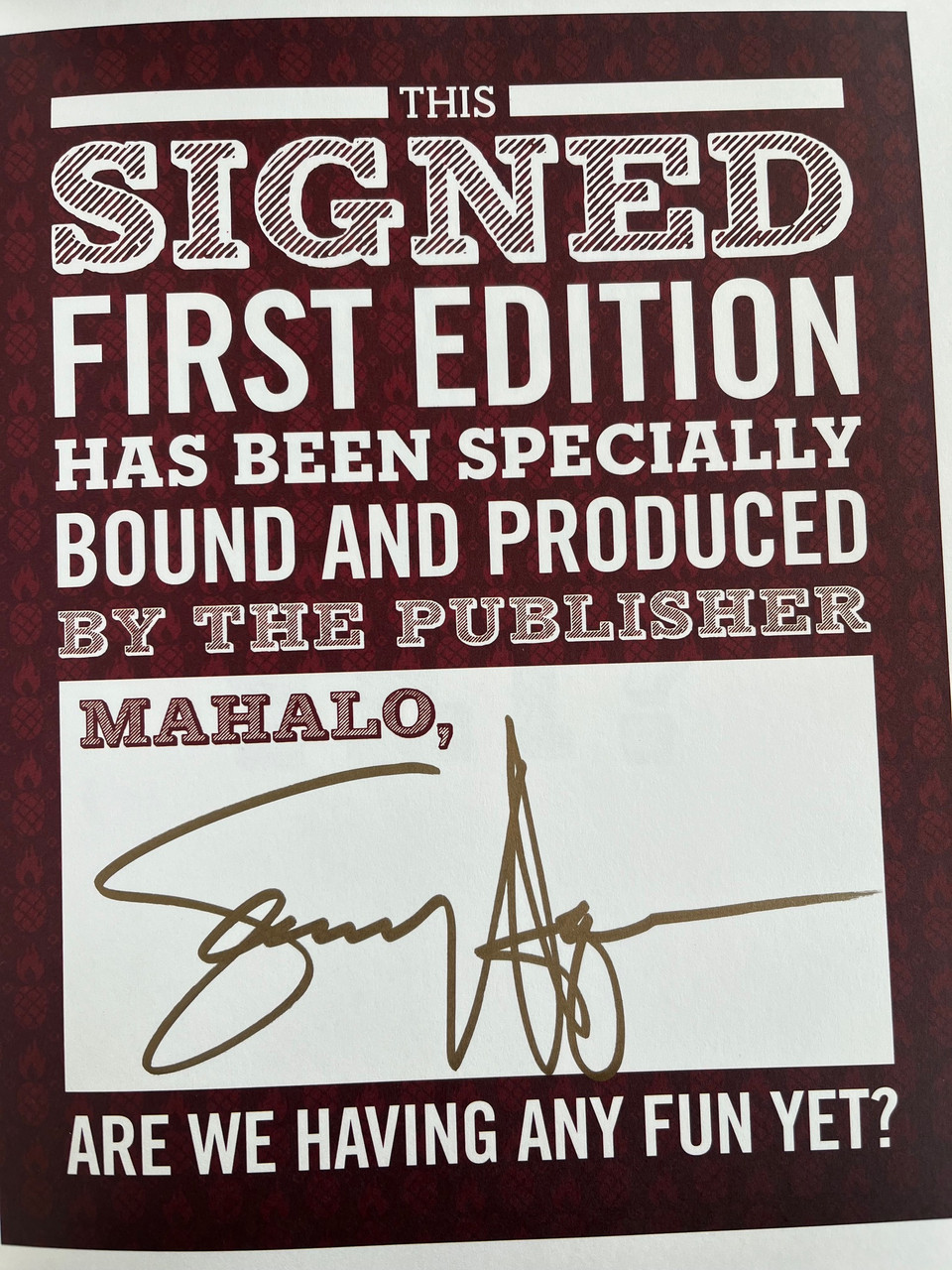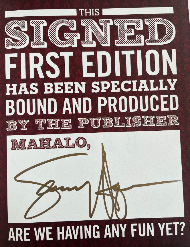 Dey Street Books (2015) Sammy Hagar "Are We Having Any Fun Yet?: The Cooking & Partying Handbook". Co-author: Josh Sens. Signed First Edition, First Printing. Personally signed by Sammy Hagar directly onto the special title page of the book with a gold pen. Hardcover book without dust-jacket as issued. Includes bookseller issued COA.