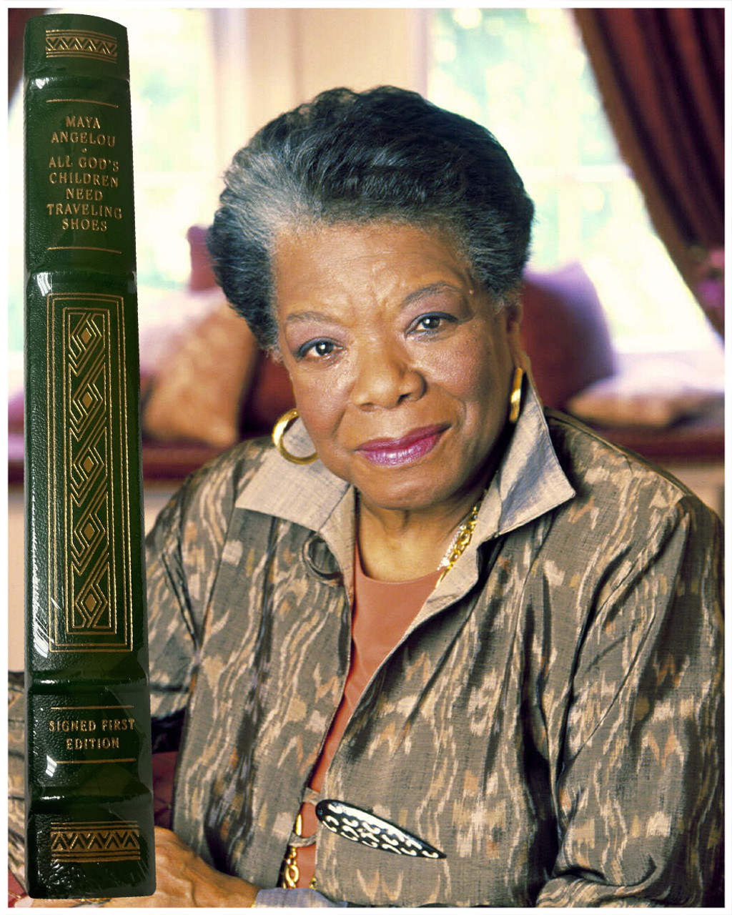 The Franklin Library 1986. Maya Angelou "All God's Children Need Traveling Shoes" Signed First Edition. Personally signed by Maya Angelou. Leather bound collector's edition with hubbed spine. Hardcover. Octavo. 211 pages. Bound in publisher's green leather with gilt lettering and decorations. Very Fine, sealed without any flaws.