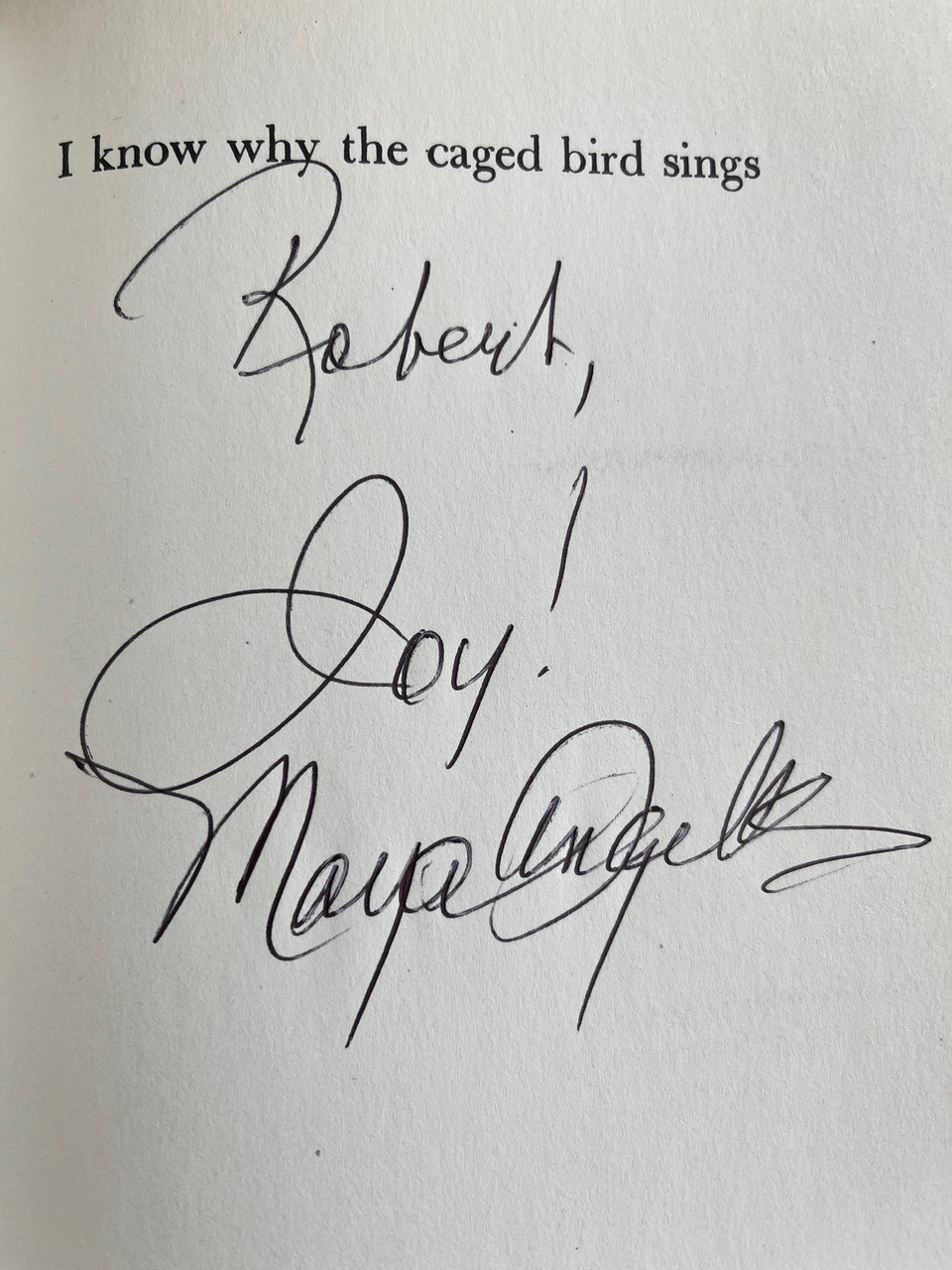 Maya Angelou was among the first African-American women to achieve high spots in the bestsellers lists this respective book that is SIGNED for your consideration namely "I Know Why the Caged Bird Sings," This book is a riveting acount of her childhood and is indeed a seminal American literary feat. In addition, it is a boundless story of inspriation and the power of resilience with dignity. Although the story is intimately individualistic, the theme is collective and inclusive being the love and universality of all lives. Angelou has frequently stated that we have a moral obligation to love. What a conept in a world that seems to be very focused on destruction. Indeed, she usually signs with the powerul word PEACE. She spoke of her early passion for the writings of William Shakespeare, and offered her audience excerpts from the poems of several prominent African-Americans authors, including James Weldon Johnson and Paul Lawrence Dunbar.