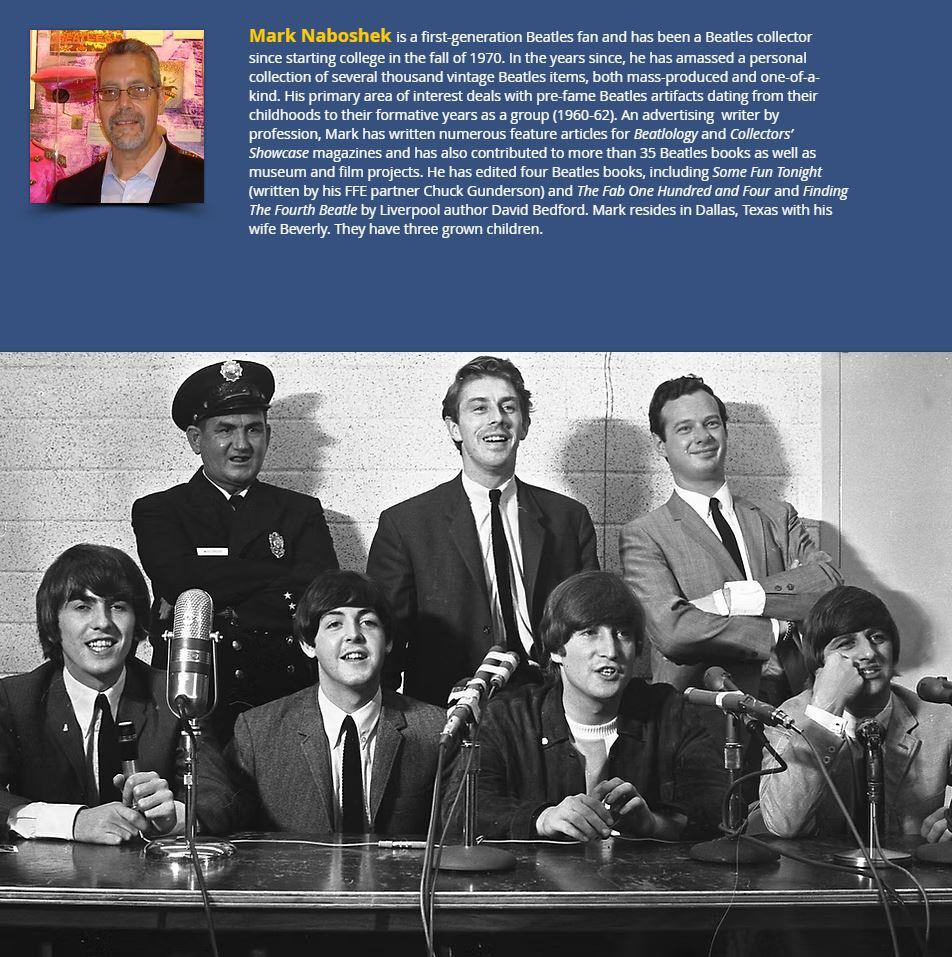Mark Naboshek is a first-generation Beatles fan and has been a Beatles collector since starting college in the fall of 1970. In the years since, he has amassed a personal collection of several thousand vintage Beatles items, both mass-produced and one-of-a-kind. His primary area of interest deals with pre-fame Beatles artifacts dating from their childhoods to their formative years as a group (1960-62). An advertising writer by profession, Mark has written numerous feature articles for Beatlology and Collectors’ Showcase magazines and has also contributed to more than 35 Beatles books as well as museum and film projects. He has edited four Beatles books, including Some Fun Tonight (written by his FFE partner Chuck Gunderson) and The Fab One Hundred and Four and Finding The Fourth Beatle by Liverpool author David Bedford. Mark resides in Dallas, Texas with his wife Beverly. They have three grown children.