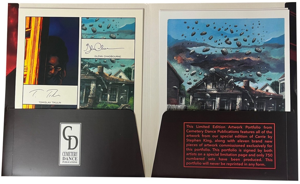 Due to demand from our collectors, we've made special arrangements with Tomislav Tikulin and Glenn Chadbourne to collect ALL of their artwork from our special edition of Carrie by Stephen King in one beautiful portfolio -- and to make this set even more exclusive and unique, Glenn Chadbourne will be creating TEN MORE BRAND NEW pieces just for this set!