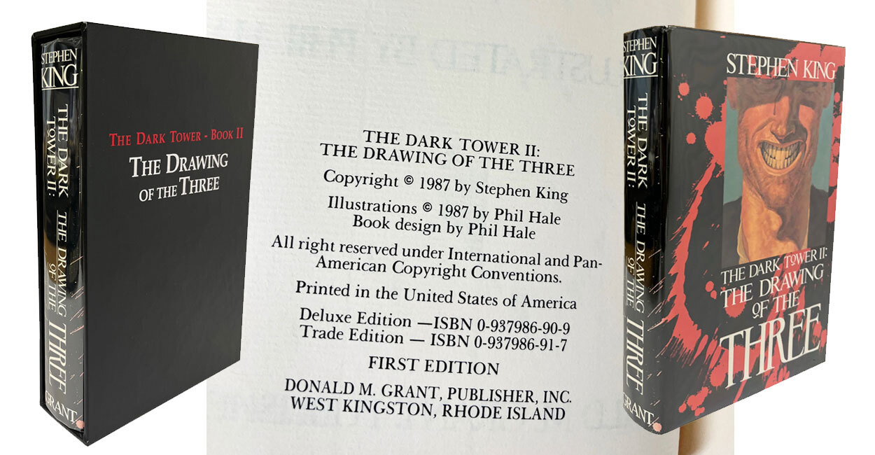Donald M. Grant Publishers. Copyright 1987. Stephen King "The Dark Tower II: The Drawing of the Three". 400 pages. Trade hardcover first edition of 30,000 copies with dust jacket, issue price $35. On the copyright page is "FIRST EDITION". Illustrated by: Phil Hale. First Edition, First Printing. Custom matching slipcase.