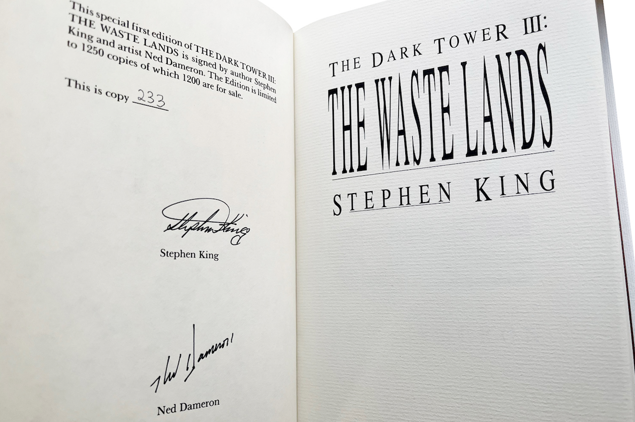 Hampton Falls, NH. Donald M. Grant Publishers 1991. Stephen King "The Dark Tower III: The Waste Lands". Signed Limited edition of only 1,250 slipcased signed and numbered copies. Signed by Stephen King and the illustrator Ned Dameron directly onto the limitation page. This is number 233. Hardcover book with original dust-jacket and slipcase. 512 pages. Original number sticker on slipcase.