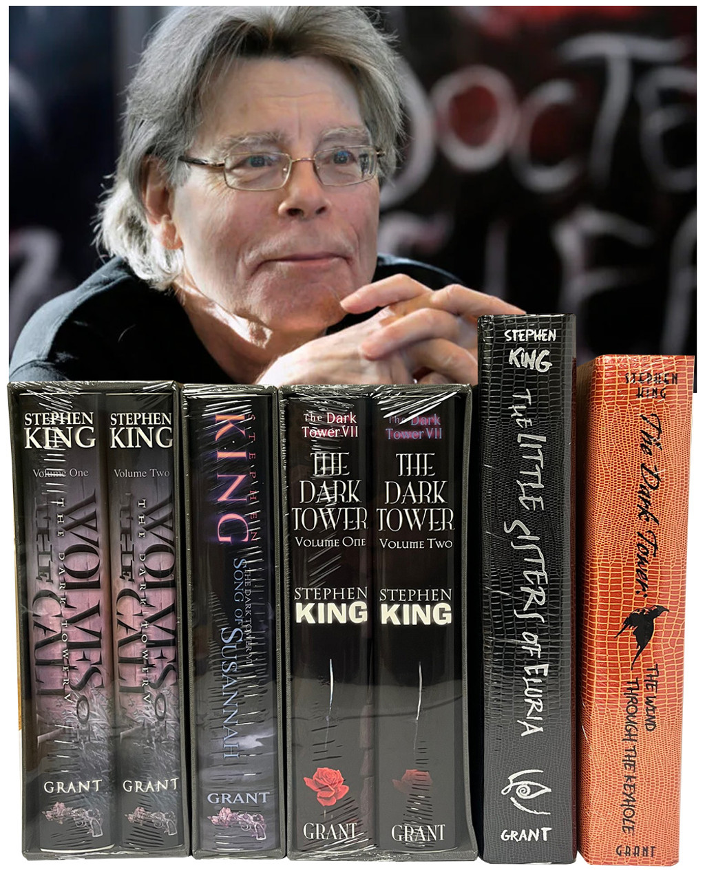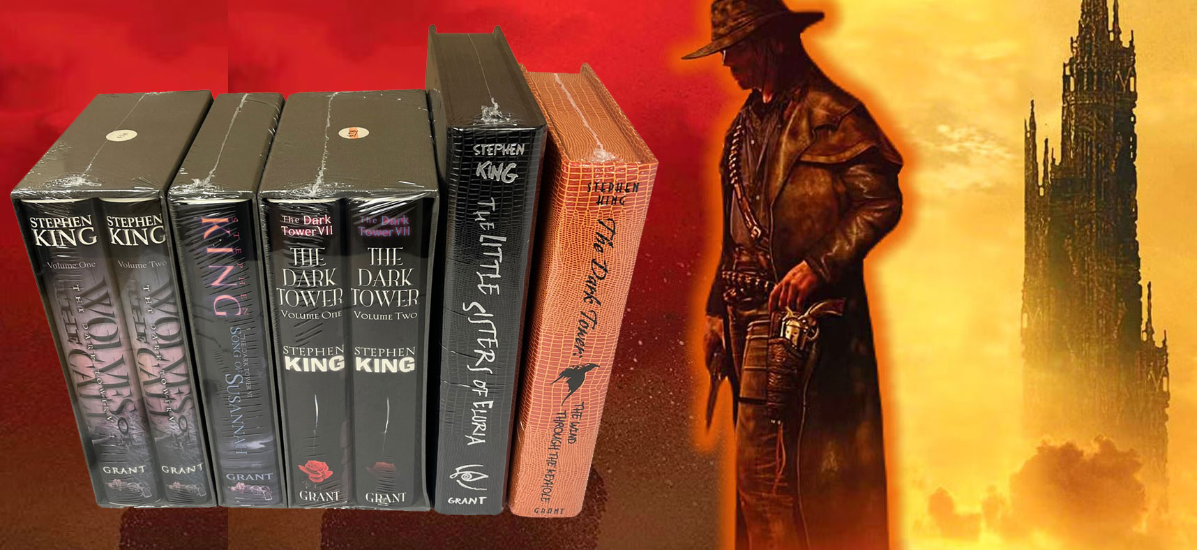 Donald M. Grant Publishers. Hampton Falls, NH. (2003-2012) Stephen King "The Dark Tower" series. Signed Limited Edition Matching Numbers Set. Volumes V, VI, VII, "The Little Sisters of Eluria", and "The Wind Through The Keyhole". Each volume is number 678. Each book features full-page color illustrations and each signed by King and the illustrator. Signed limited first editions, issued simultaneously with the first trade editions. The original number stickers are still present on the slipcases of the volumes.