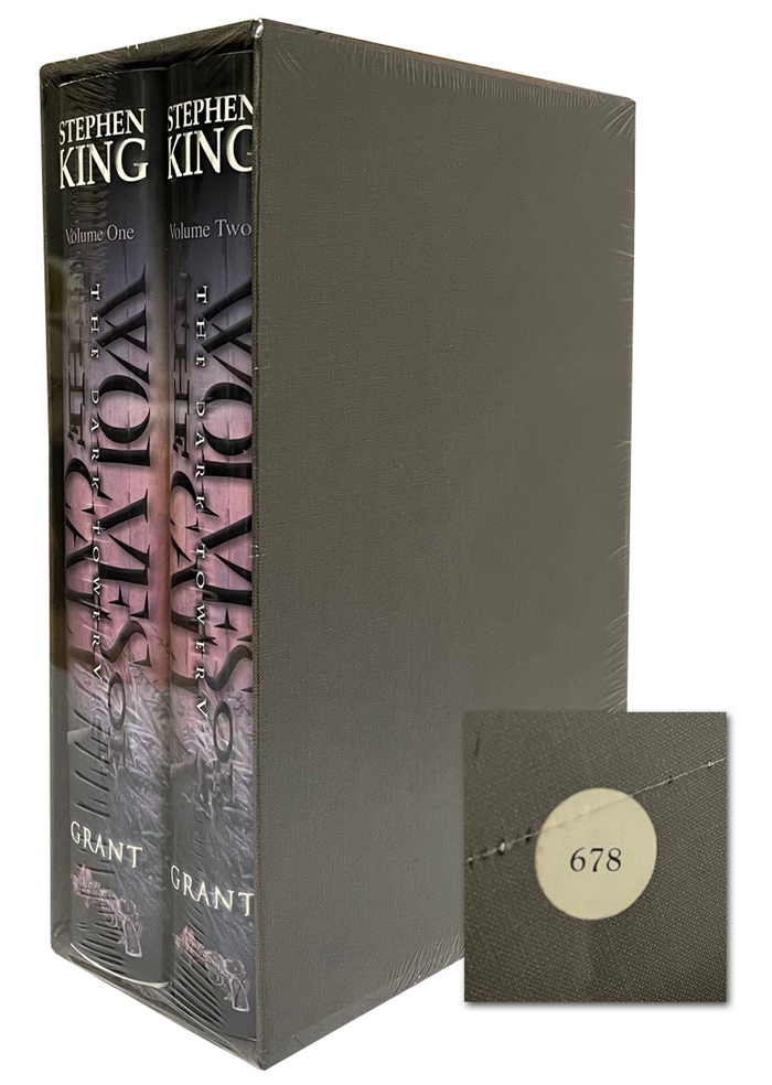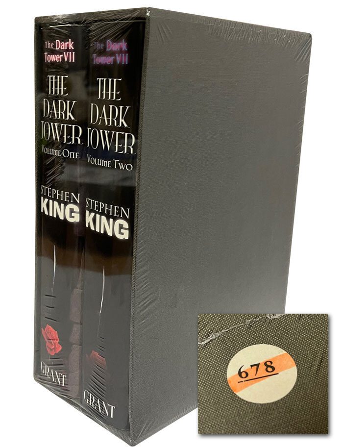 Donald M. Grant. 2004. Stephen King "The Dark Tower VII: The Dark Tower" Signed Limited Edition #678 of 1500. Limited edition of 1,500 slip-cased numbered copies, signed by Stephen King along with the illustrator Michael Whelan. Issued in two volumes with slipcase. Sealed. Very Fine without any flaws. Original number sticker.