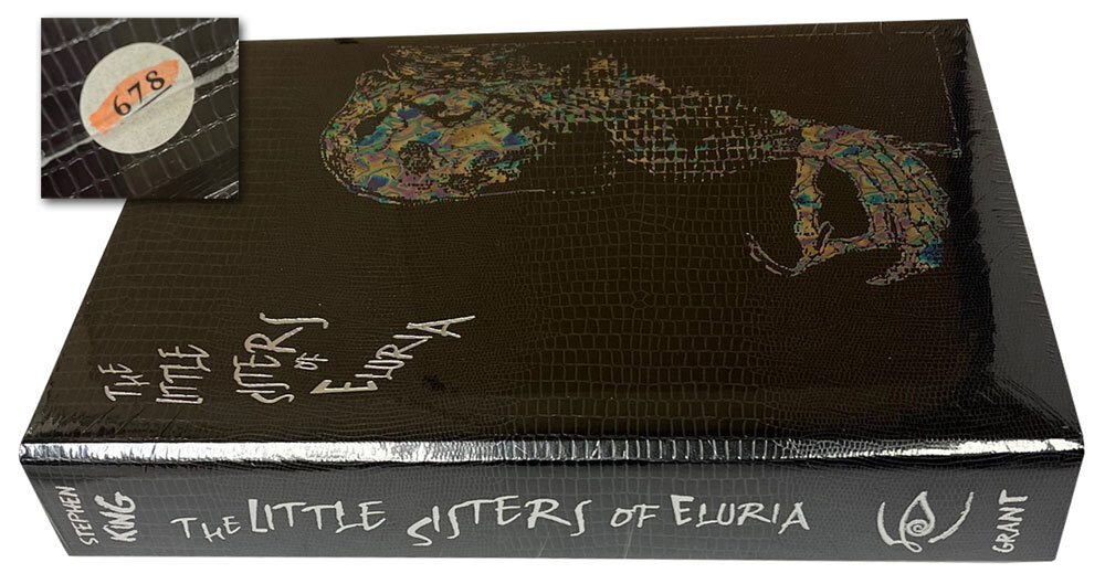 Donald M. Grant Publishers 2009. Stephen King "The Little Sisters of Eluria". Signed Limited Edition No. 678 of 1,250. Limited edition of 1,250 copies, complete with clam-shell tray case, numbered and signed by Stephen King along with the illustrator Michael Whelan. Sealed. Very Fine without any flaws. Original number sticker.