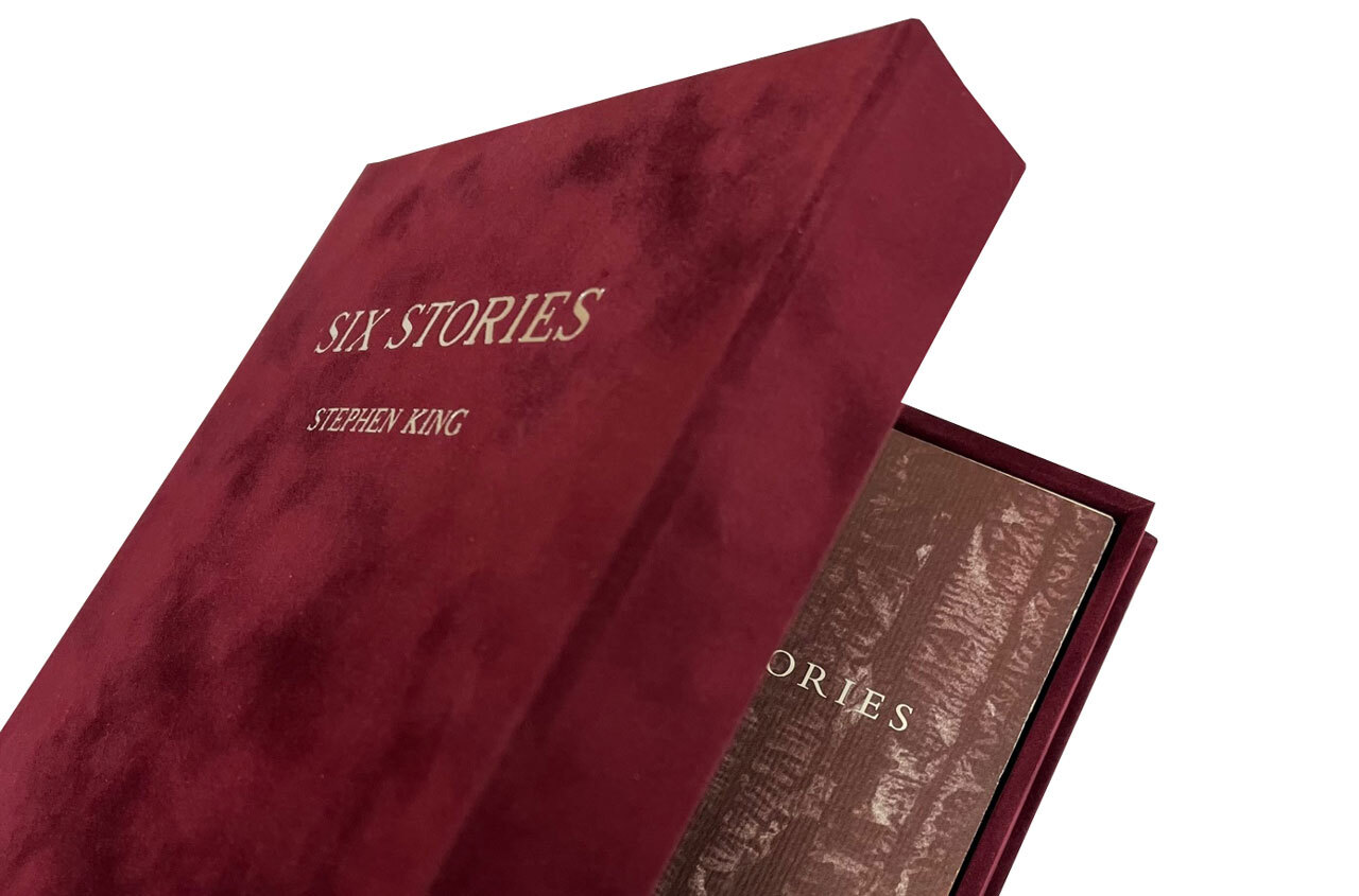 Luxurious custom clam-shell presentation box for the softcover signed limited edition of "SIX STORIES" by Stephen King. Protect your investment with this custom made presentation box especially designed and built to house this book.