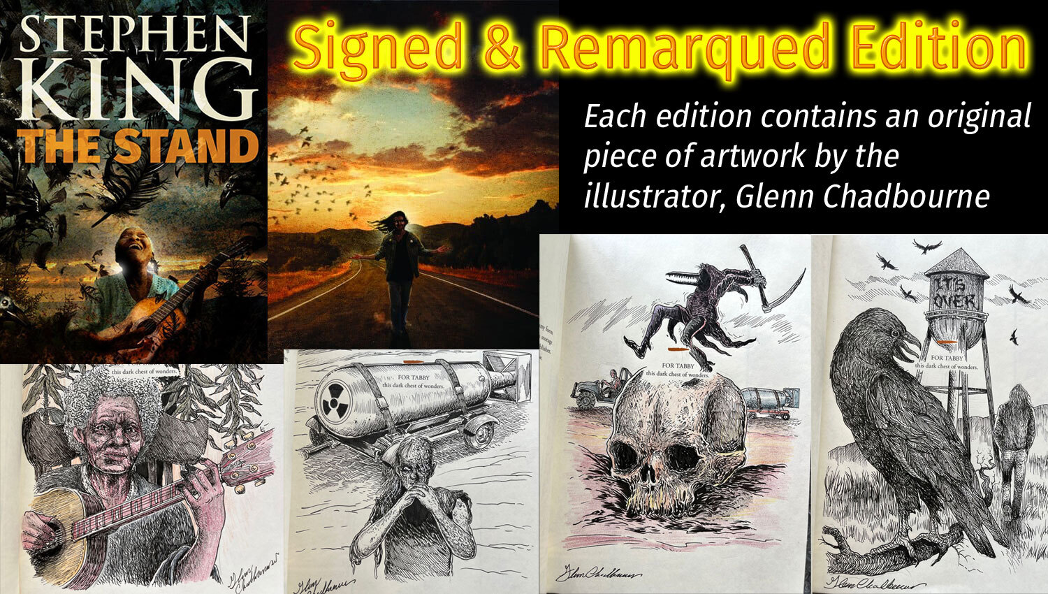 Be the first to order and choose your favorite Signed Artist Remarque of Stephen King's THE STAND. This is the deluxe gift edition, personally signed and remarqued by the master illustrator, Glenn Chadbourne!