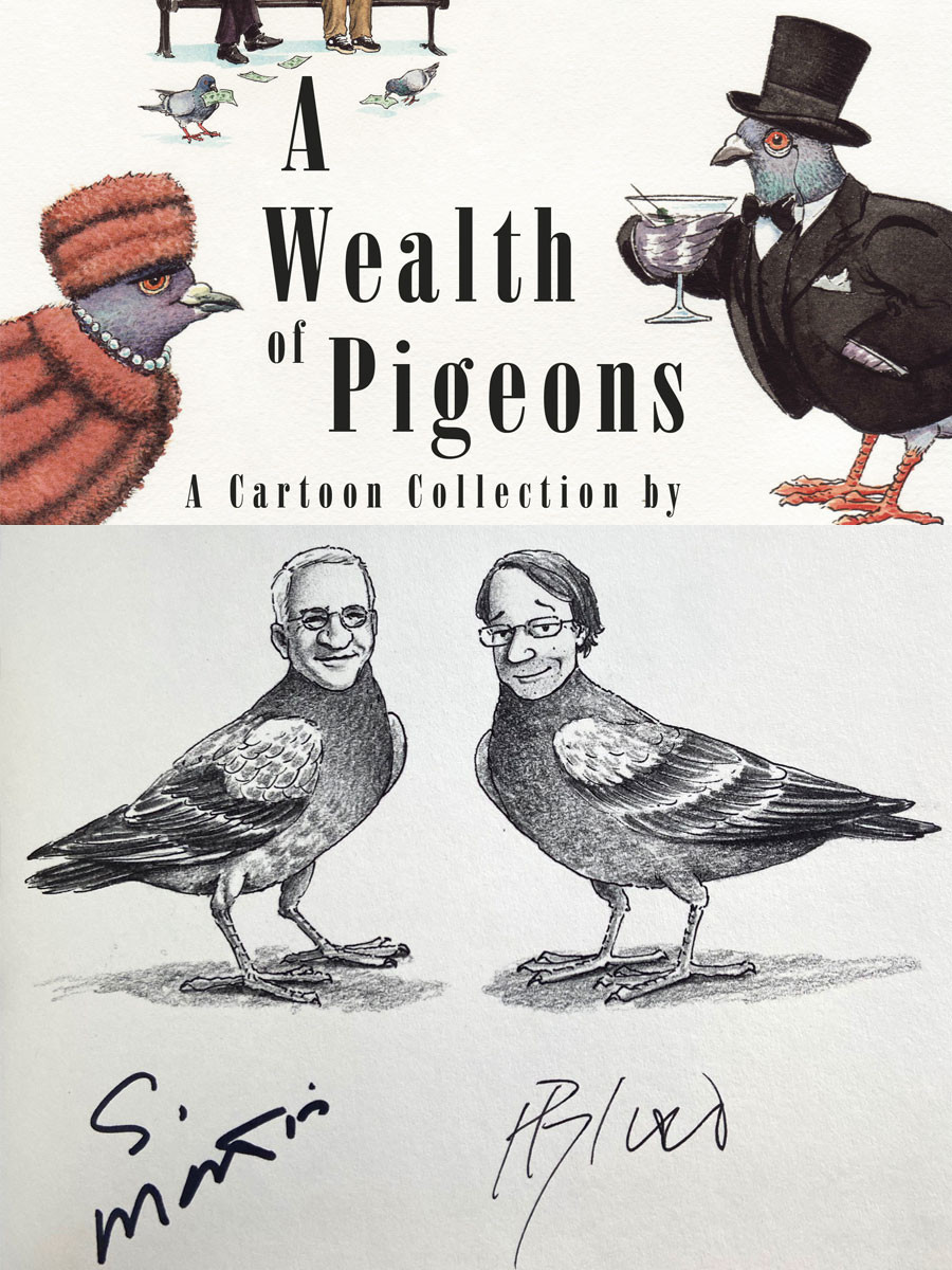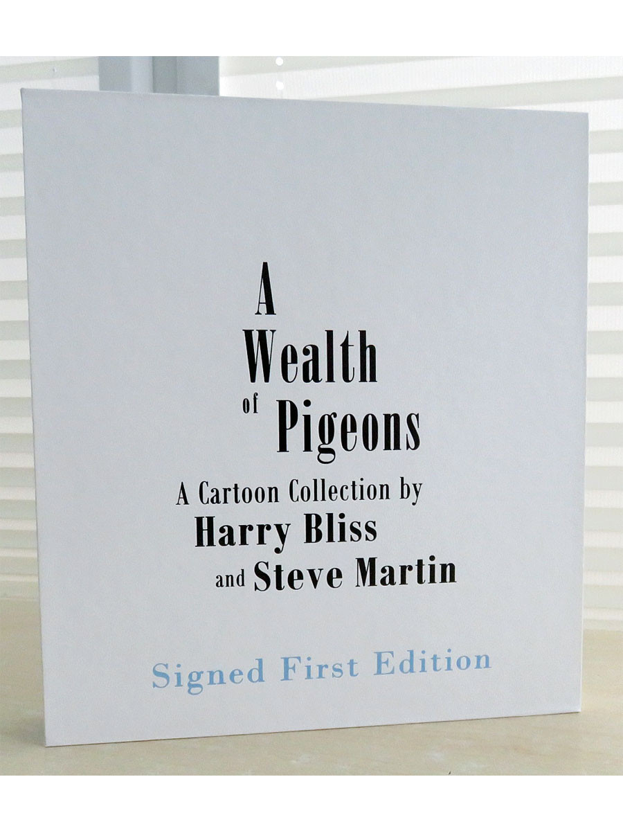 Celadon Books (November 17, 2020). Steve Martin and Harry Bliss. "A Wealth of Pigeons: A Cartoon Collection by Harry Bliss and Steve Martin". This first edition has been personally signed by both authors directly into the book. Limited to several "BC" slipcased copies with Certificate of Authenticity. Sealed.