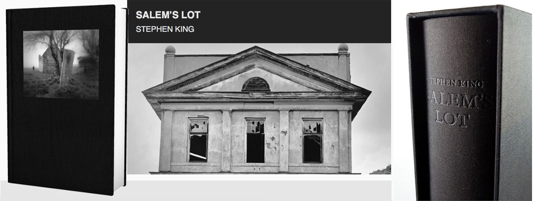 Our edition of Salem’s Lot was widely held to be the best Stephen King-limited edition ever published. The trade edition was printed on 100# Mohawk Superfine and measured 9 × 13 inches. It had Jerry Uelsmann photographs reprinted as gorgeous duo-tones. It was bound in full black cloth and signed by Stephen King and Jerry Uelsmann. The spine of the text block is sagging a little bit as is likely common with this heavy book