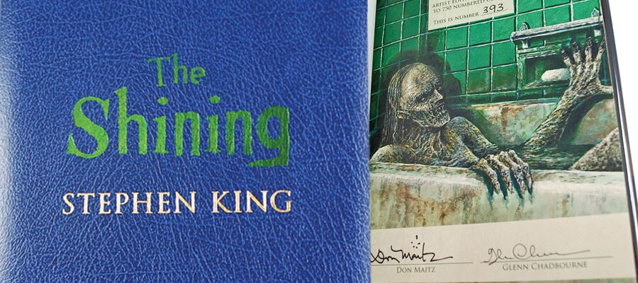 Cemetery Dance Publications. 2017. Stephen King "The Shining" Traycased Oversized Hardcover Numbered Artist Edition. This edition is signed by the artists Glenn Chadbourne and Don Maitz. Limited to only 750 hand-numbered copies printed in two colors on a specialty paper stock; bound with a different fine binding, two color hot foil stamping, and full color illustrated endpapers; a full-color signature sheet featuring artwork by Glenn Chadbourne. This edition is housed in a tray-case.